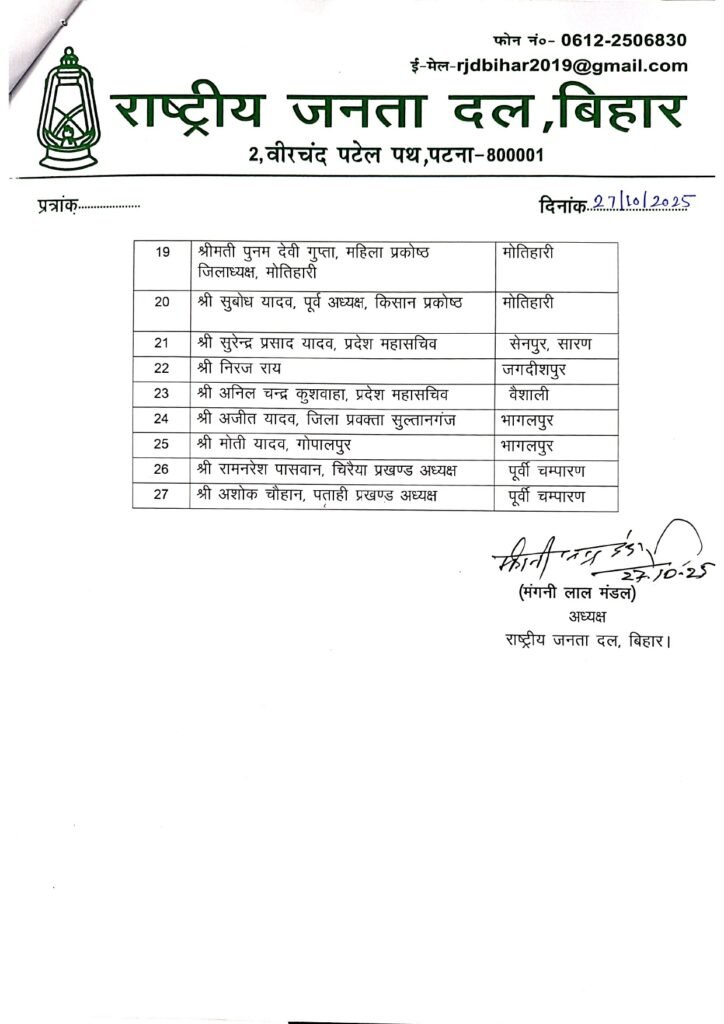 27 अक्टूबर को जारी राजद के आधिकारिक पत्र में स्पष्ट कहा गया कि पार्टी अनुशासन और निष्ठा से कोई समझौता नहीं करेगी। बयान में कहा गया कि चुनावी दौर में संगठन की मजबूती बनाए रखने के लिए ऐसे तत्वों पर सख्त कार्रवाई जरूरी है।