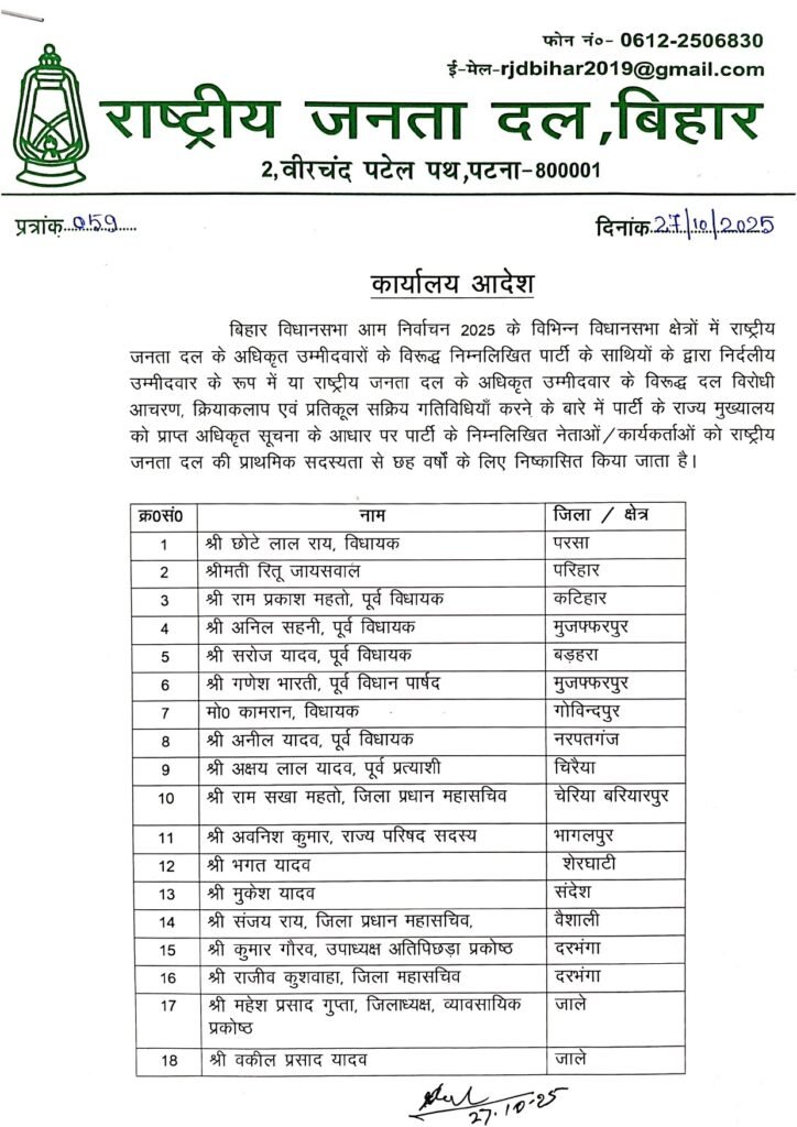 बिहार विधानसभा चुनाव से ठीक पहले राष्ट्रीय जनता दल (राजद) ने बड़ी सख्ती दिखाते हुए पार्टी विरोधी गतिविधियों में लिप्त 27 नेताओं को बाहर का रास्ता दिखा दिया है। निष्कासित नेताओं में दो मौजूदा विधायक, चार पूर्व विधायक और एक विधान पार्षद भी शामिल हैं।